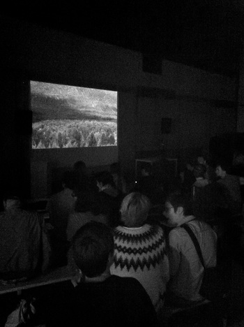 Misha projected a wall to wall image of a 6 x 7 slide of a corn field. The audience had the possibility of losing themselves in the image. The corn was sharp, the ground unsharp, that kept the image exciting with a lot to discover. This collective experience might have been more intense than the experience of a photo print at the wall. After 1 minute Misha's telephone timer went of.
